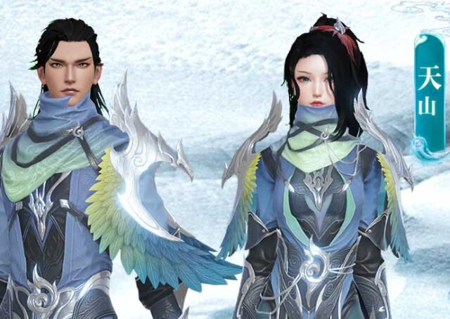 天山高檔時裝極具規劃感,漆黑是刺客最好的夥伴,玄青色的戰甲與緊束修身的裁剪帶來極強的壓迫感。雙肩靈鷲印記散發著金屬的寒意,靈鷲雙翅光彩流動,整體調配顯著與中原門派不同,更富有異域風情。 身後飾帶末端皆配有利器,仿佛夜色中的一寸流星,冷艷而又危險。下擺處相同以暗紋繡製靈鷲徽記,這是敵人倒下後才能察覺到的冷漠,也是童姥縱橫西域的赫赫威名。